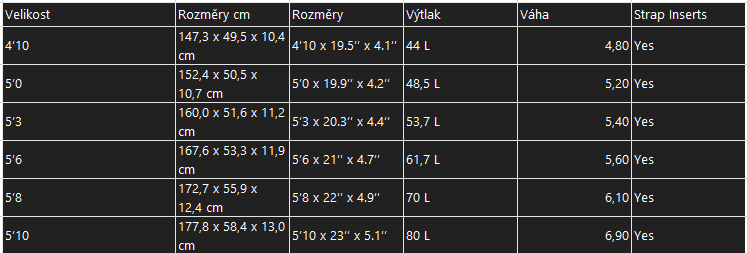 Řada ROCKET WING-S byla upravena a nyní nabízí pět velikostí od 4’10 (44 l) do 5’9 (64,5 l). Kompletní bamboo konstrukce a dvojité bambusové vyztužení decku vytvářejí lehký, ale velmi odolný obal prkna.